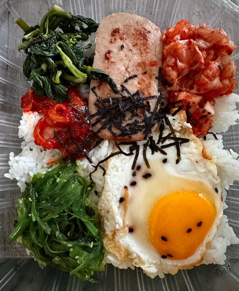 AKA: Gyeran bap (egg rice). The food that the participants of the "Squid Game" ate as a lunch box was reproduced in the same way. Experience the amazing taste created by simple ingredients at Namsan. 1) Fried egg, 2) white rice, 3) grilled SPAM, 4) ripe Kimchi, 5) sesame oil, 6) shredded dry seaweed, 7) spinach, 8) seasoned seaweed salad, and 9) black sesame seeds, 10) seasoned squid. You may choose an extra egg from "Egg-in food-options".