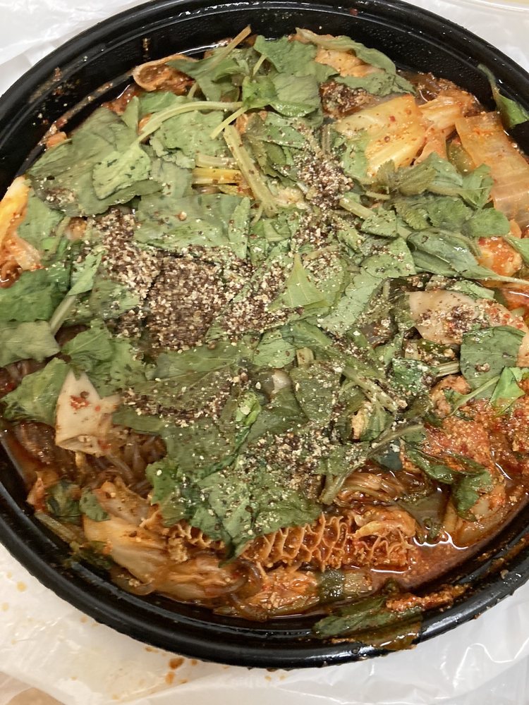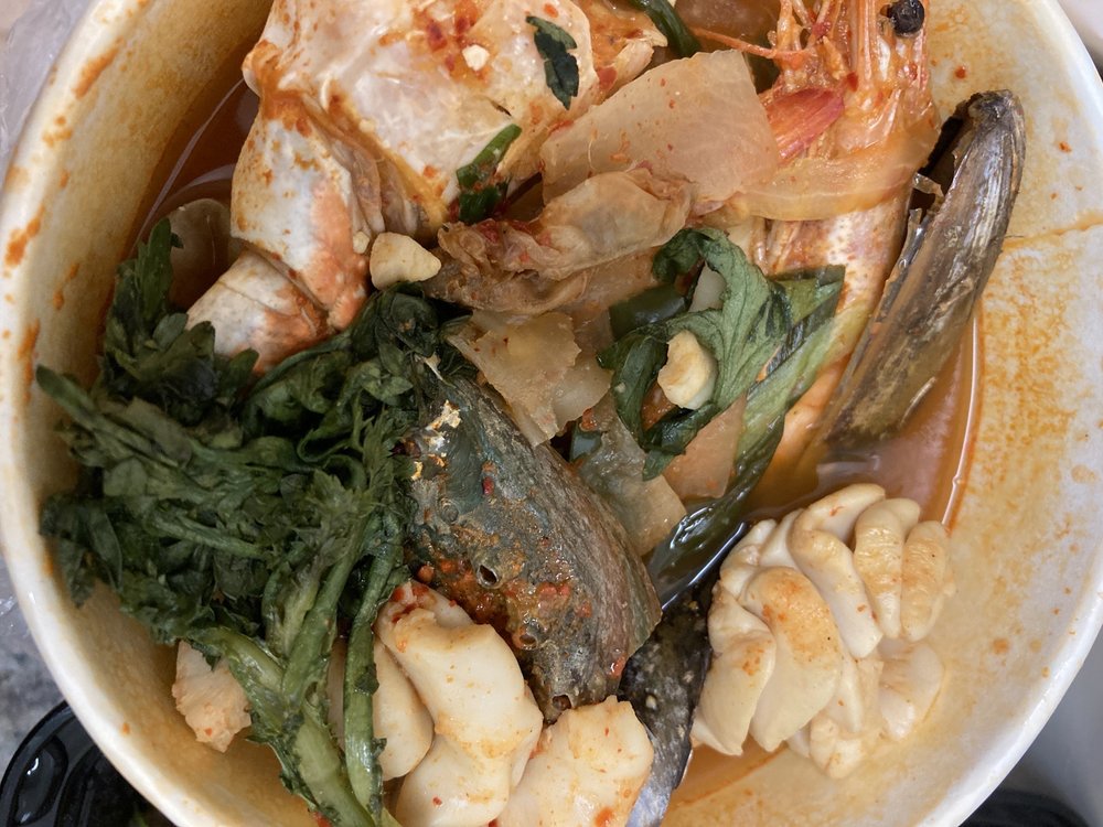 AKA: "Al-Tang". Chunks of cod roe and intestine () with mushroom and crown daisy. With a box of steamed rice. Addictive. Spicy. Seafood lover's #1 choice among Koreans.