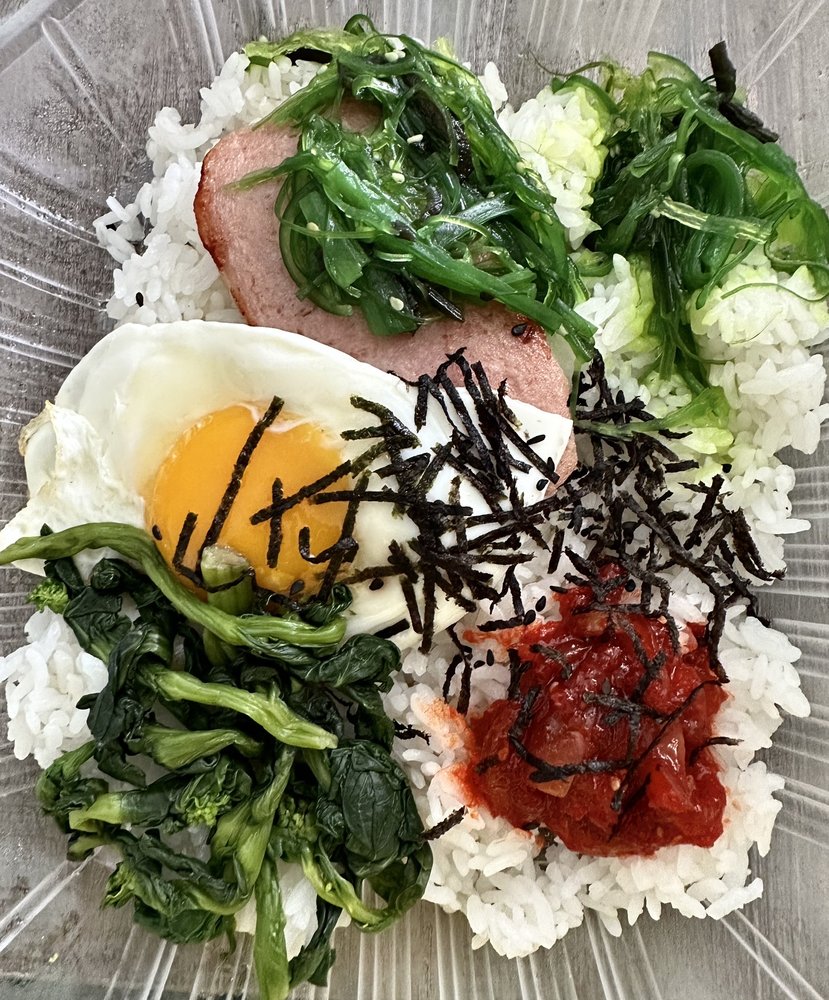 A bowl of rice topped with an ingredient like protein and vegetables. Steamed rice, Shredded cabbage and dressing, Grilled SPAM, Don-ka-tsu, baby pickle, Mayo-tuna, and Fried egg.If you need to add hot sauce, just add " add Sriracha" in the special instruction.
